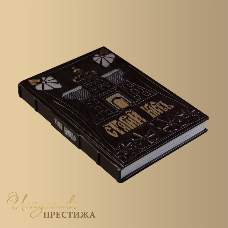 О переплете: переплет французский цельно-Кожаный, ручной работы. Кожа цвета эбенового дерева (Италия). Рельеф на коже и тиснение выполнены вручную. Кругленные корешки книг украшают высокие бинты. Обложка декорирована гравированной композицией, цвет - "золото" и "серебро". Каптал шелковый, ручного плетения. Форзац составной. Обрез полированный, цвет - "серебро".