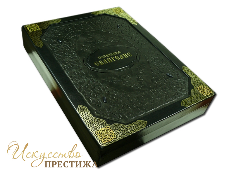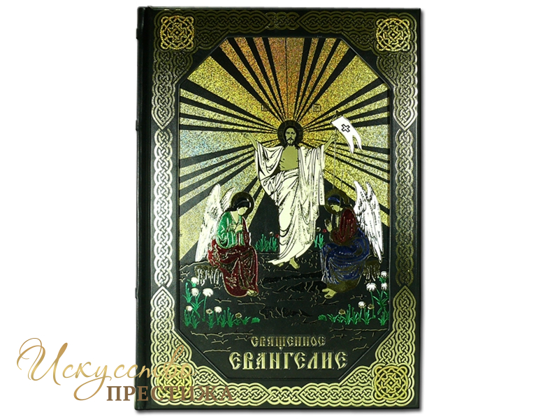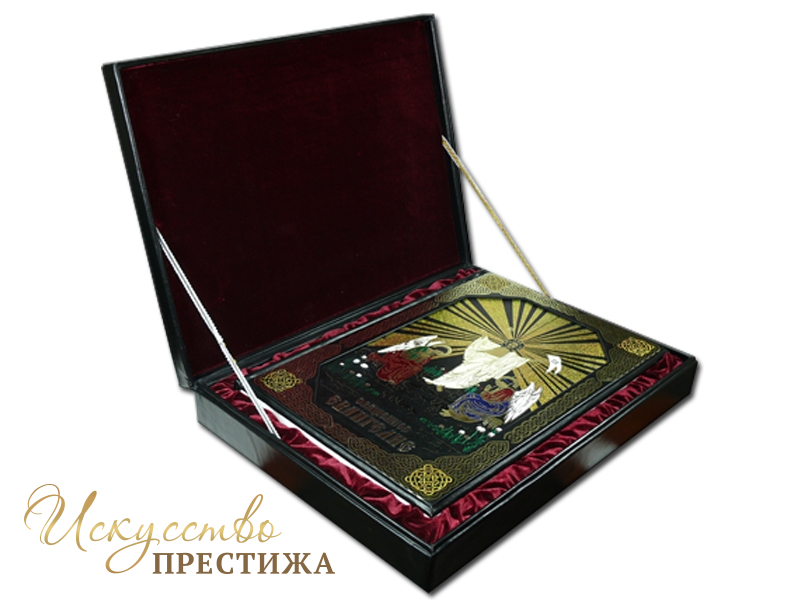 Кожаный переплёт ручной работы, оформленный авторской композицией из тиснения «Воскресение Христово», с использованием трёх видов фольги. Подарочный футляр, выполненный из комбинации натуральных кож (кожа “Nataly”, кожа “Moto Alfredo” Италия).