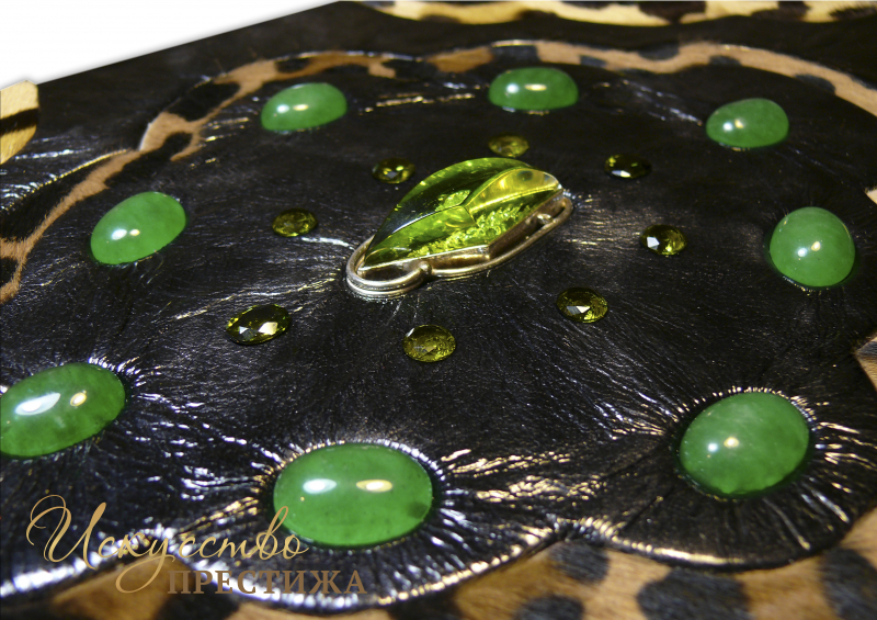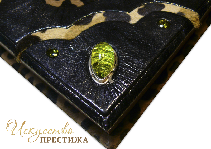 Французский переплет ручной работы изготовленный из комбинации натуральных кож (Кожа козья «Avrora Vernice»; шкура пони «Dolmen-леопард »; Кожа морской змеи «Эбен»; производства ведущих итальянских фабрик). Обложка книги оформлена объемными узорами ручного тиснения, с инкрустацией камнями циркон (цвет «олива», высший сорт, производства компании Signity ) брильянтовой огранки (диаметр 10 мм.) количеством 4 шт.; (диаметр 8 мм.) количеством 6 шт.; овальной огранки (диаметр 10 мм.) количеством 6 шт., камнем хризопраз, огранки кабошон (диаметр 20 мм.), количеством 11 шт., зеленым янтарем в оправе, количеством 5 шт.