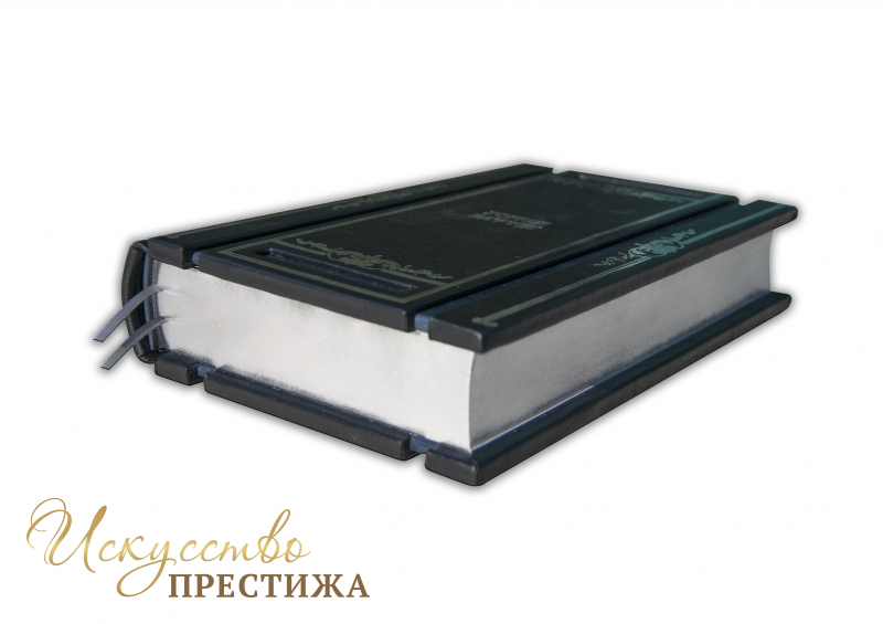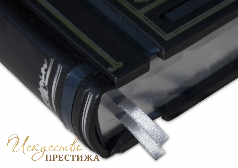 Французский составной переплет ручной работы выполнен из комбинации натуральной кожи (Кожа теленка «Nero Zegna», Кожа «Robbat Blue» производства итальянской кожевенной фабрики «Carisma»). Обложка книги уникальной двухуровневой архитектуры оформлена рельефным серебряным тиснением c использованием фольги «Luxor 240». Обрез книги вручную полирован и посеребрен сусальным серебром.