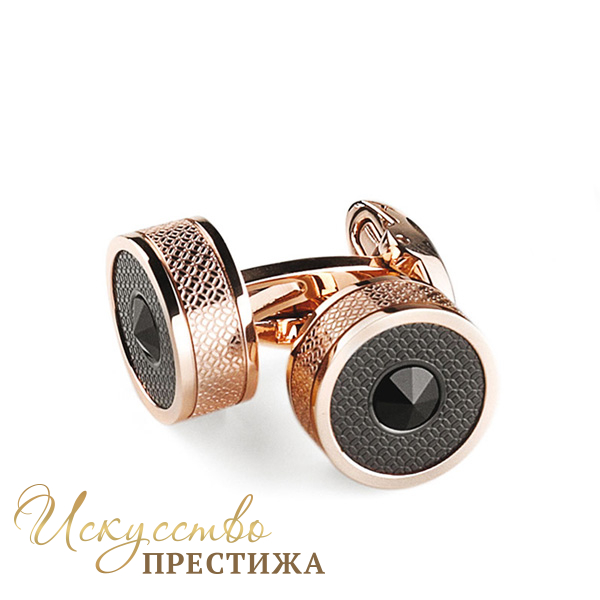 Изысканные запонки классической круглой формы изготовлены из высококачественной нержавеющей стали и декорированы филигранным геометрическим узором. Строгие линии аксессуара подчеркивают лаконичные детали, покрытые розовым золотом. Роскошный кристалл черного цвета венчает лицевую часть. Обратная сторона отмечена годом создания компании Elmo & Montegrappa. Изделие оснащено удобной застежкой, которую украшает выгравированный логотип.
