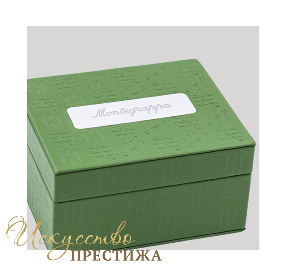 Обновленная шкатулка зеленого цвета покрыта узором из амбиграммы Montegrappa.