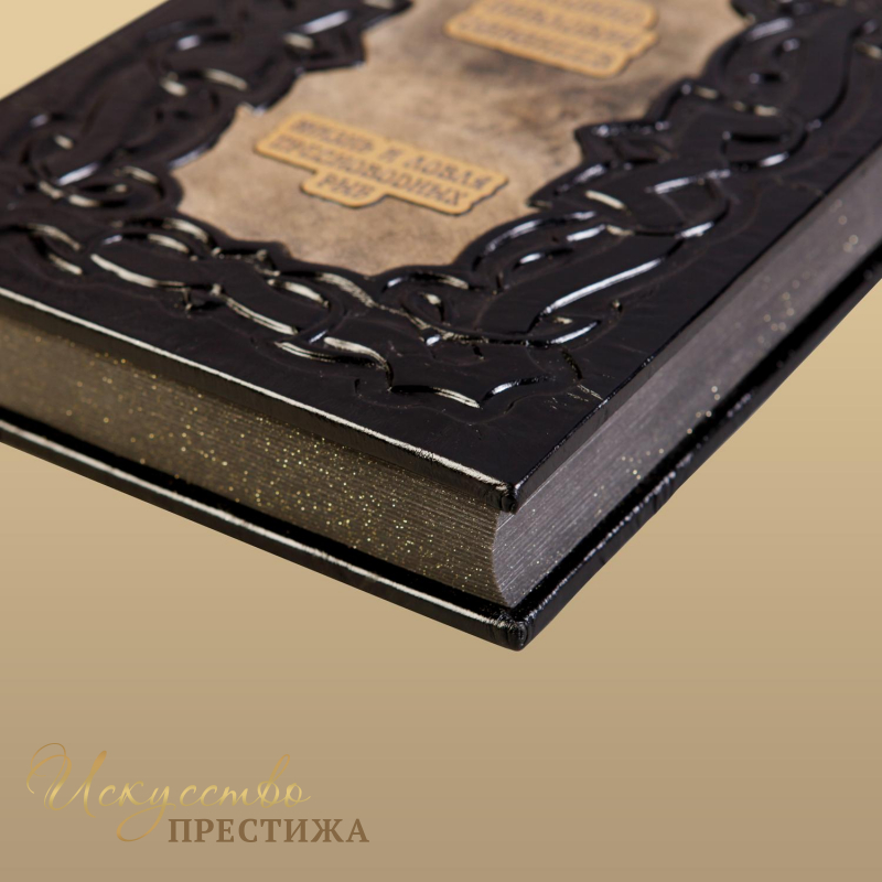 О переплете: Переплет французский цельноКожаный, ручной работы. Кожа цвет эбен (Италия). В центре художественная композиция, обрамление – гравировка, цвет золото. Каптал шелковый, ручного плетения. Форзац составной. Обрез полированный, окрашенный вручную, цвет черный шоколад.Техники в изготовлении переплета: гравировка, высокий рельеф и тиснение по коже.