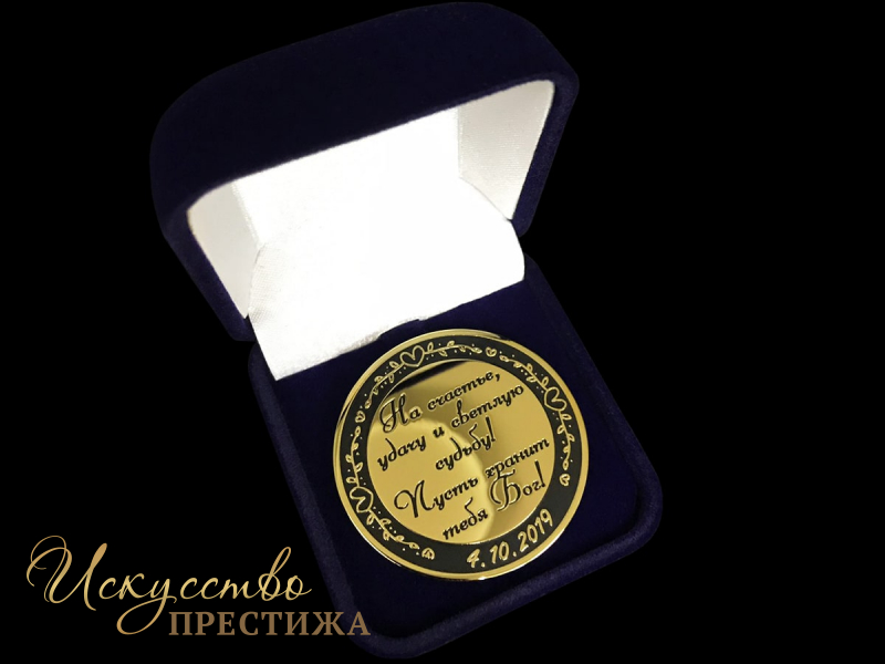 Золотая монета 585 пробы была создана специально к Дню рождения малютки Амелины от ее крестной мамы. На аверсе изделия мастера изобразили портрет именинницы, используя черную эмаль, а на реверсе подарка выгравировано искреннее пожелание и дата рождения. Дизайн монеты может быть любым, в соответствии с особенностями вашего заказа.