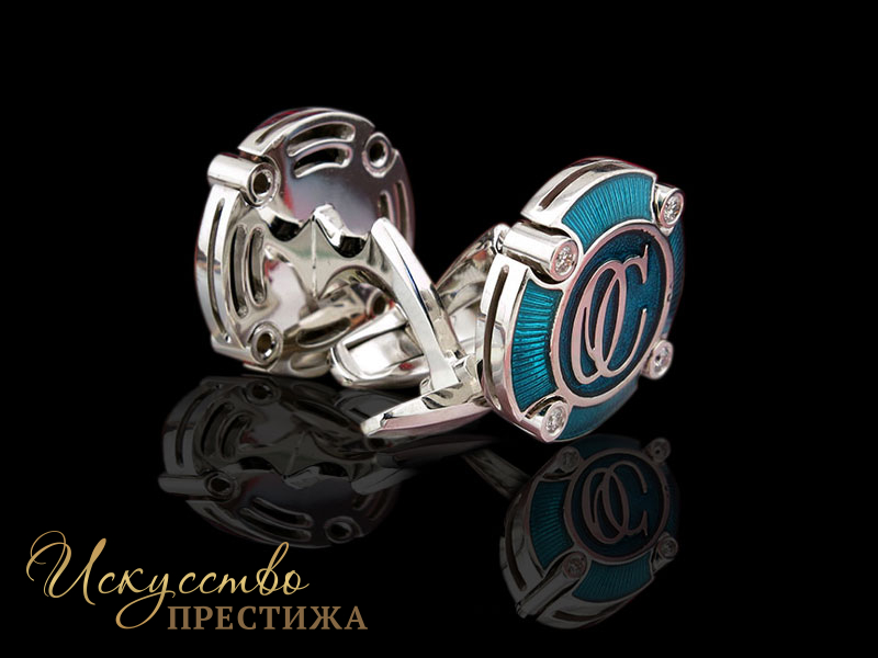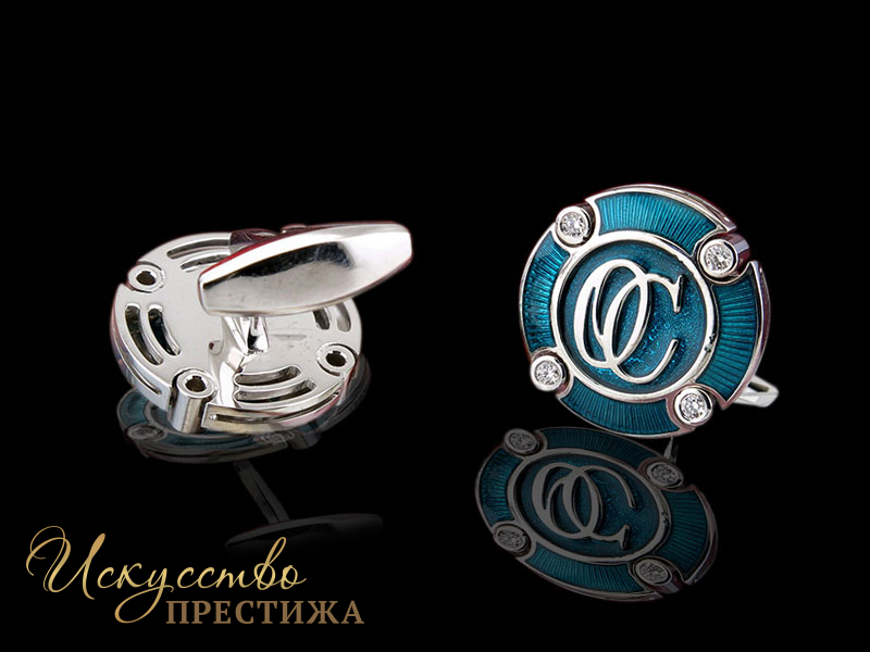 Запонки с инициалами "ОС" изготовлены из белого золота 750 пробы, фон - ювелирная эмаль, вставка бриллиант. Срок производства 21 рабочий день со дня утвеждения макета.